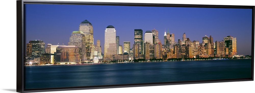 <p>Panoramic photograph taken of smaller skyscrapers that sit on the edge of water in New York City.</p>