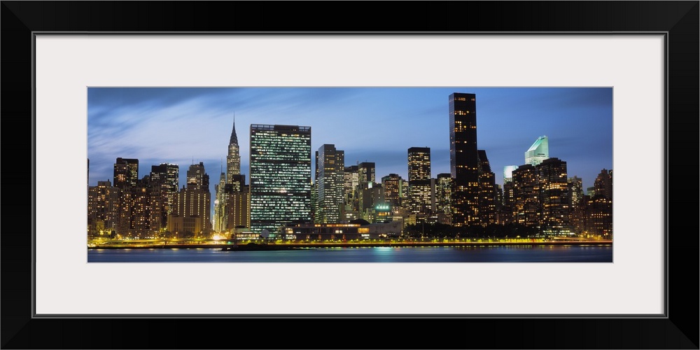 <p>Giant, panoramic photograph of the New York City skyline lit up at night.</p>