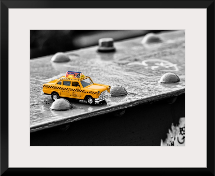 <p>A photograph of a toy taxi cab sitting on a steel beam on the Brooklyn bridge.</p>
