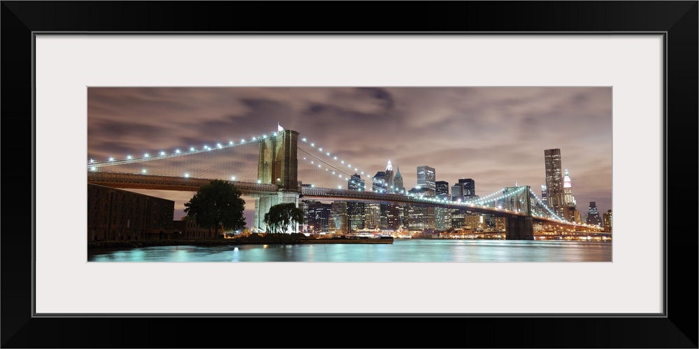 <p>Panoramic view of Manhattan with Brooklyn Bridge at night with skyscrapers illuminated over the Hudson River.</p>