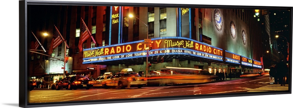 <p>Panoramic view of Radio City Music Hall from the street corner at night, lit up by neon lights and with taxis passing by.</p>