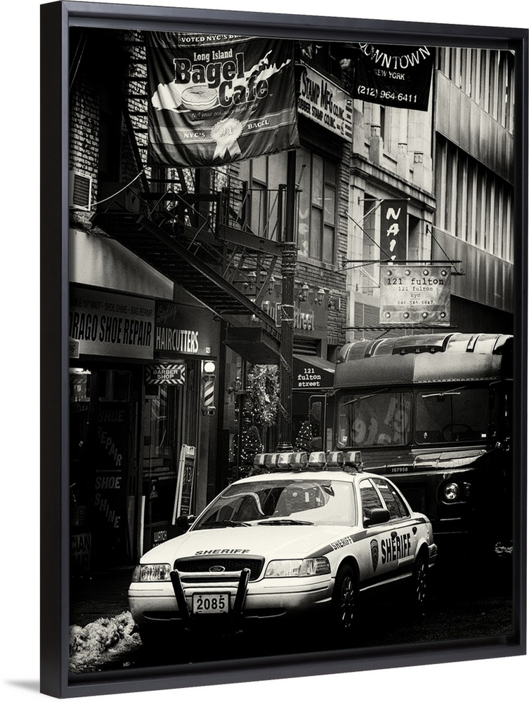 <p>A black and white photograph of an NYPD police car in New York city.</p>