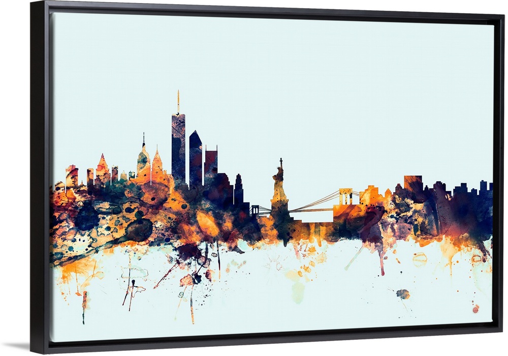 <p>Dark watercolor silhouette of the New York city skyline against a light blue background.</p>