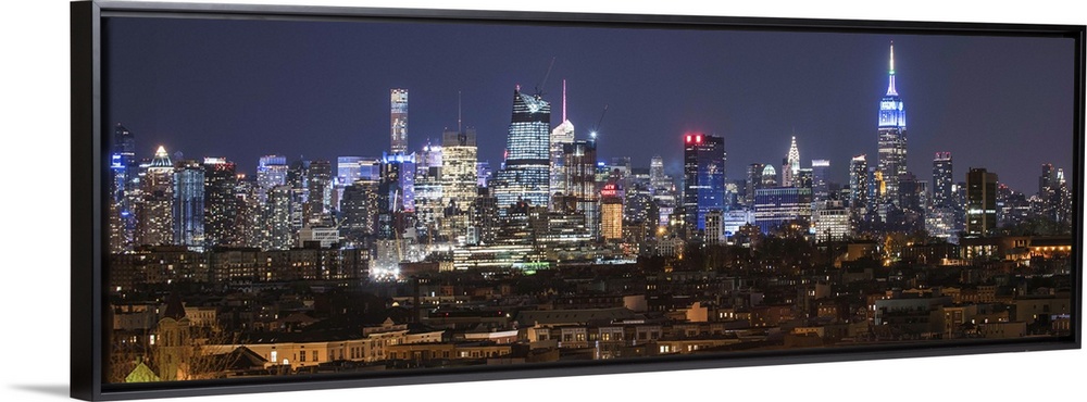 <p>Panoramic image of skyscrapers in New York City glowing at night.</p>