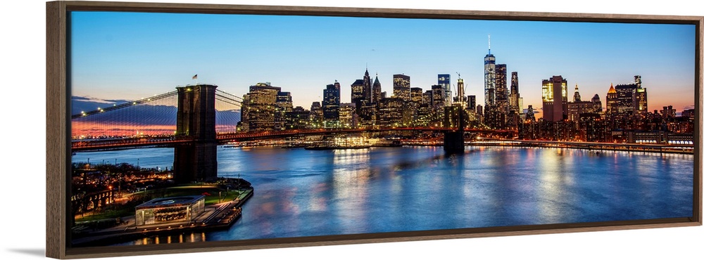 <p>Panoramic view of the New York City skyline illuminated at night, with the Brooklyn Bridge, from across the water.</p>