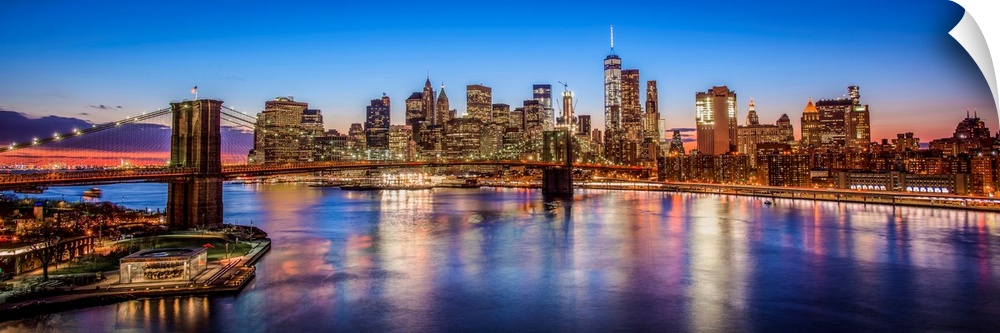 <p>Panoramic view of the New York City skyline illuminated at night, with the Brooklyn Bridge, from across the water.</p>
