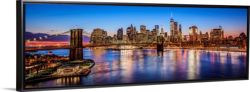 <p>Panoramic view of the New York City skyline illuminated at night, with the Brooklyn Bridge, from across the water.</p>