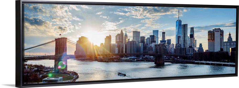 <p>View of the New York City skyline as the sun setting with the Brooklyn Bridge, from across the water.</p>