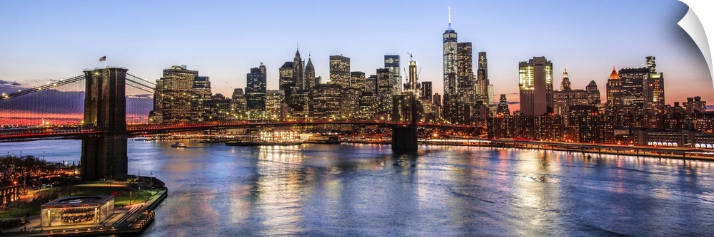 <p>View of the New York City skyline illuminated at night, with the Brooklyn Bridge, from across the water.</p>