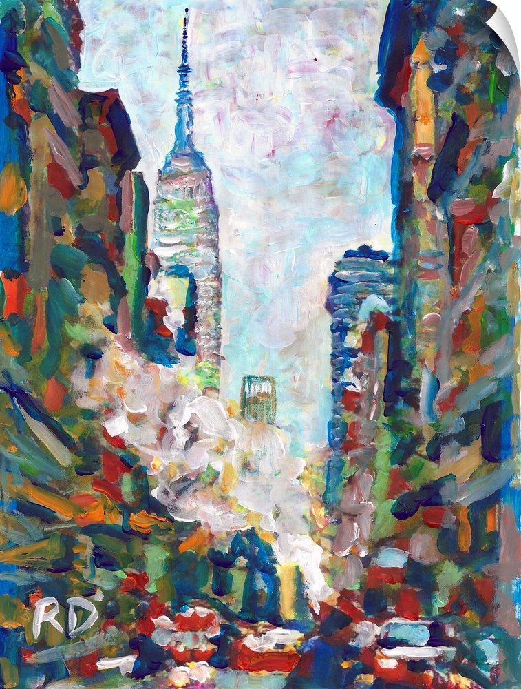 <p>NYC, Winter Steam on Fifth Avenue with Empire State Building by RD Riccoboni, Abstract painting of NYC in green, blue, red, orange, white and yellows. Architectural and Geometric shapes brushwork and brushstrokes.</p>