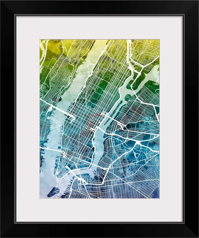 <p>A watercolor street map of Manhattan, New York City.</p>