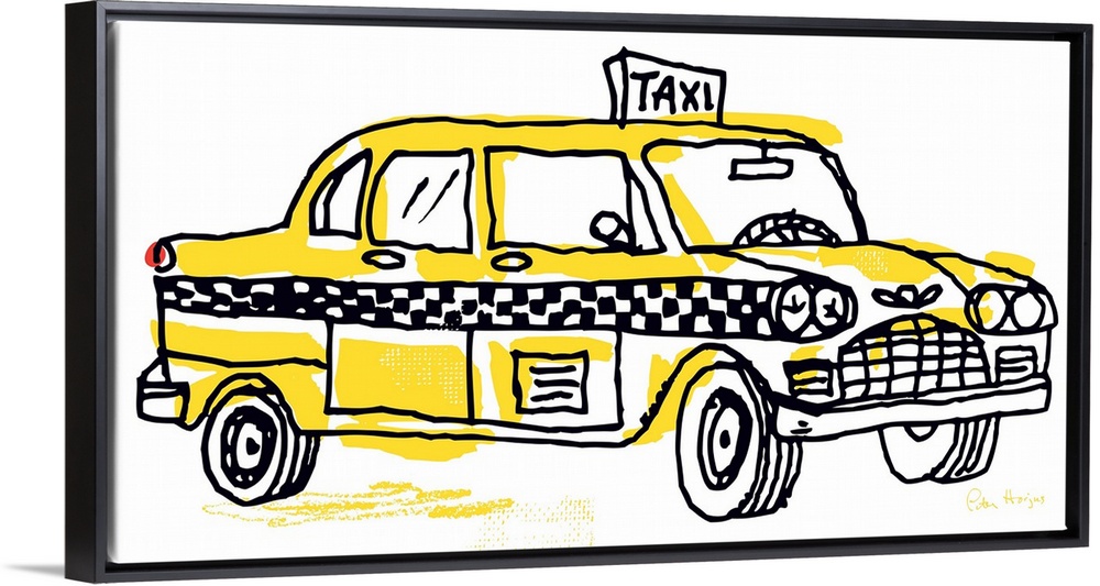 <p>Pen and ink illustration of a yellow vintage New York taxi cab.</p>