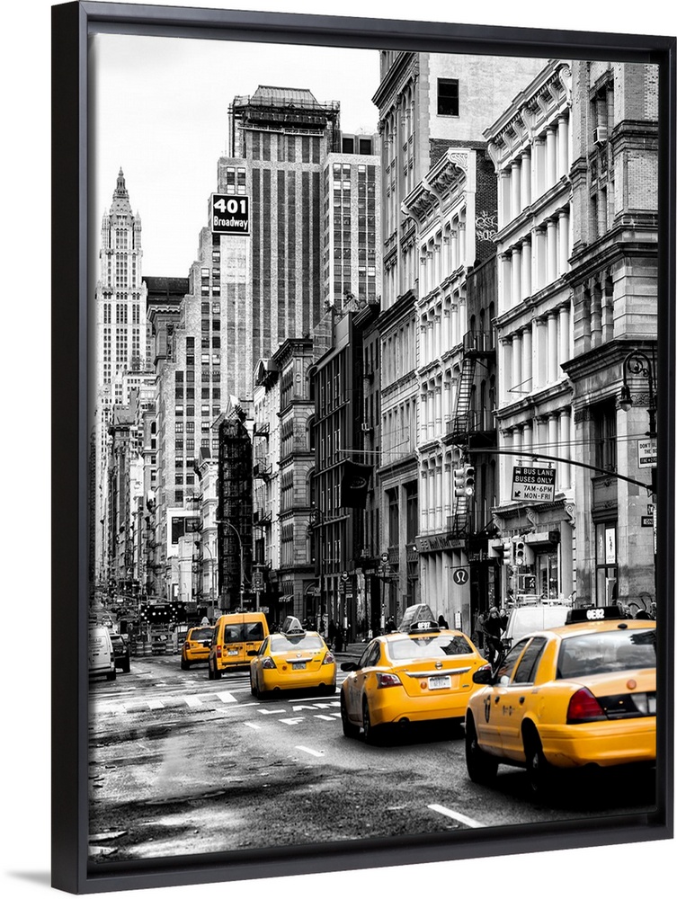 <p>A black and white photograph of New York city with bright yellow colored taxis on the road.</p>