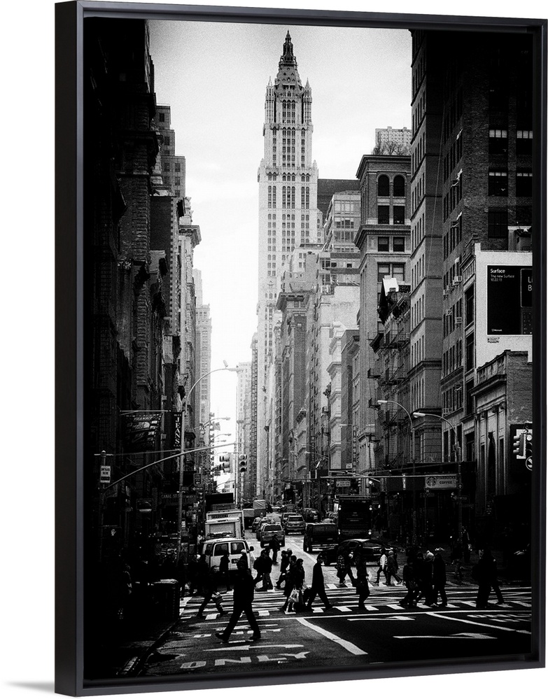 <p>A black and white photograph of urban life in New York city.</p>