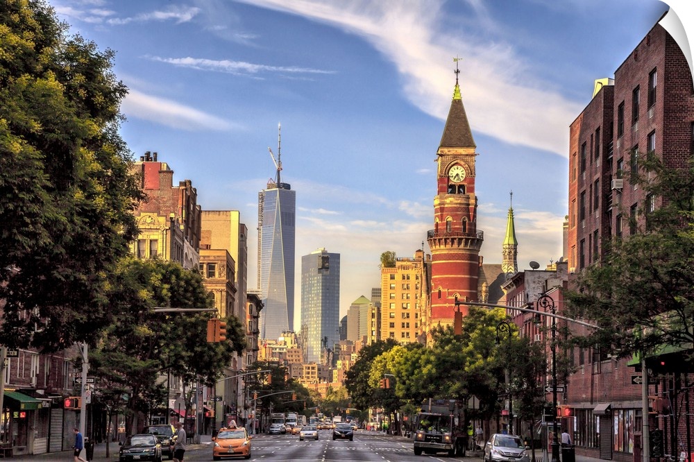 <p>New York, New York City City, View down 6th Avenue with Jefferson Market Library and Freedom Tower.</p>