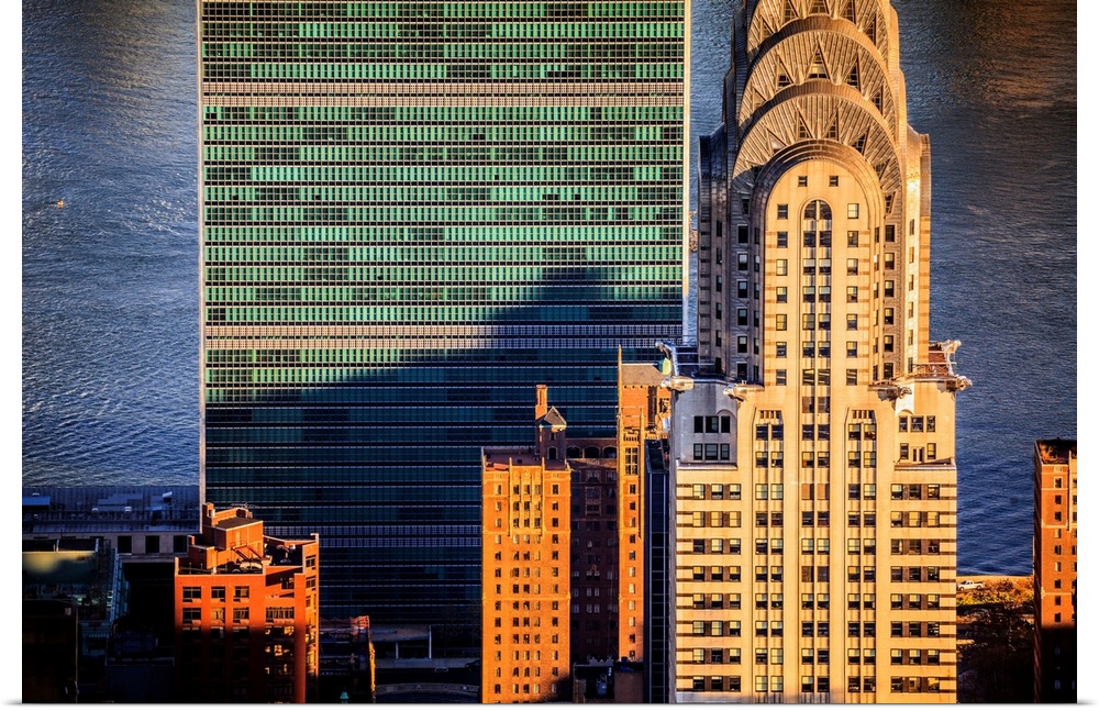 <p>USA, New York City, Manhattan, Midtown, Chrysler Building, Aerial view towards Chrysler Building and United Nations Headquarters at sunset.</p>