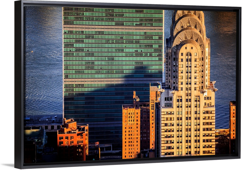 <p>USA, New York City, Manhattan, Midtown, Chrysler Building, Aerial view towards Chrysler Building and United Nations Headquarters at sunset.</p>