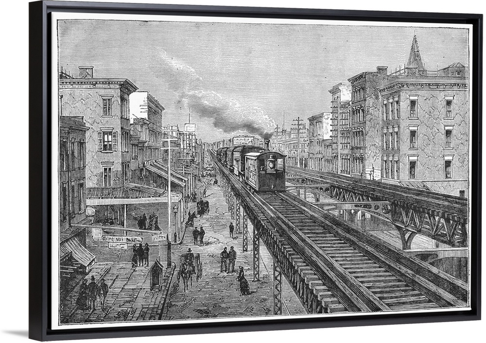 <p>New York City's first municipal elevated railroad, running from the Battery to Central Park. Wood engraving, French, c1878.</p>