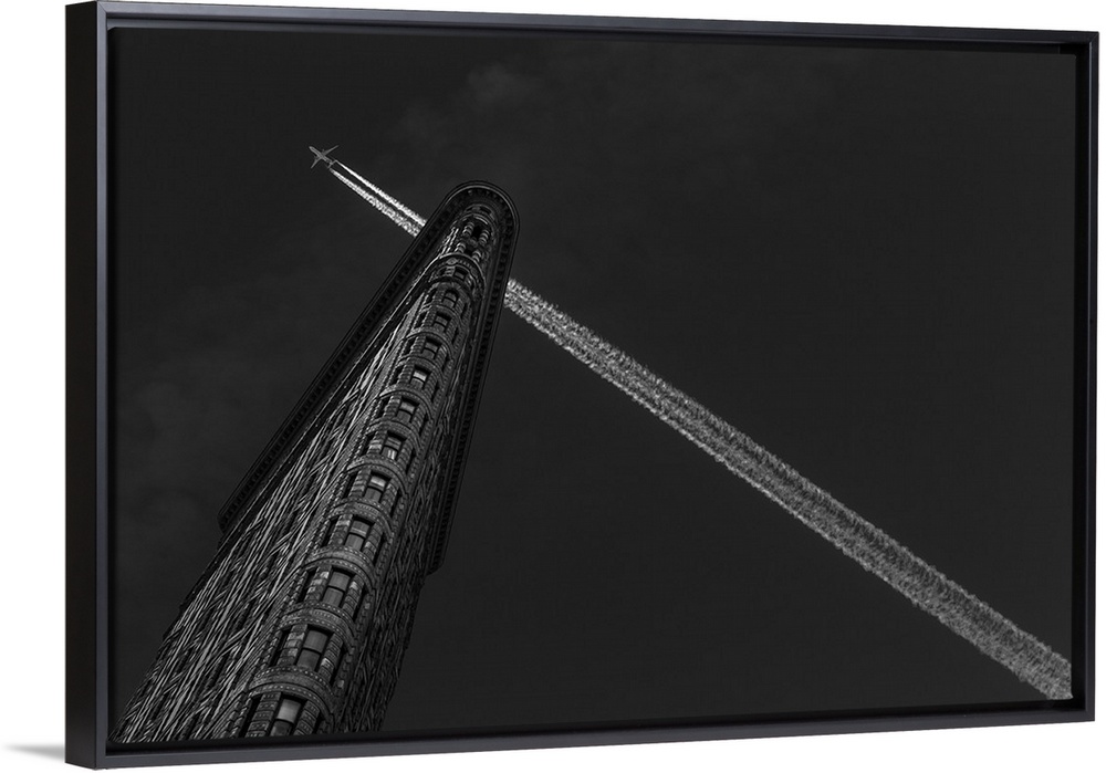 <p>An airplane's contrails crossing perpendicularly to the Flatiron Building in New York City.</p>