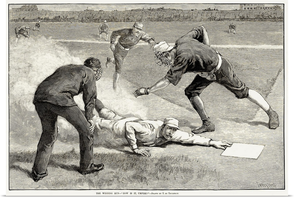 <p>New York Giants' catcher William 'Buck' Ewing slides home safely under Chicago White Stockings catcher Silver Flint to score the winning run in a 1-0 game at the Polo Grounds, New York, 6 August 1885. Wood engraving after Thure de Thulstrup from a contemporary American newspaper.</p>