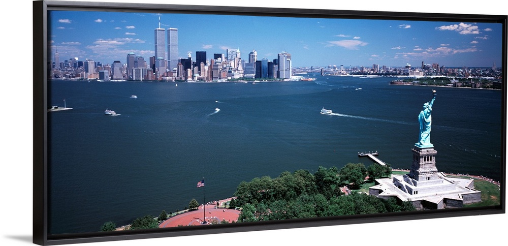 <p>Big, horizontal photograph of the Statue of Liberty and the New York Harbor. The New York City skyline in the background.</p>