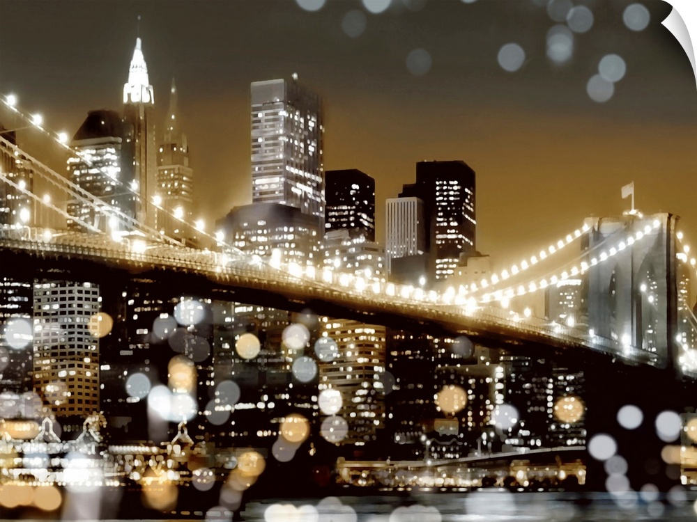 <p>Image of the New York City skyline at night in black, white, gold, and silver, with the Brooklyn bridge and bokeh lights in the foreground.</p>