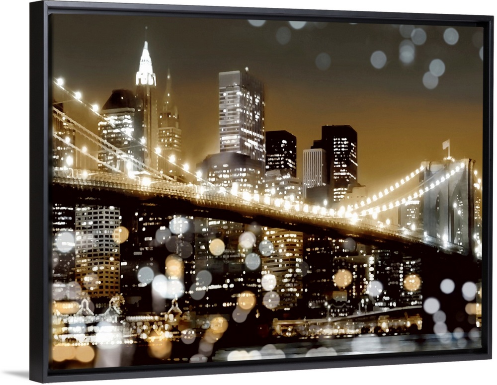 <p>Image of the New York City skyline at night in black, white, gold, and silver, with the Brooklyn bridge and bokeh lights in the foreground.</p>