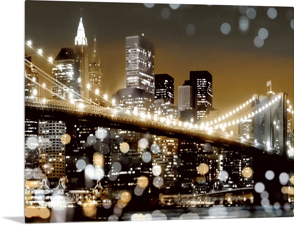 <p>Image of the New York City skyline at night in black, white, gold, and silver, with the Brooklyn bridge and bokeh lights in the foreground.</p>