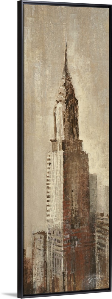 <p>A long vertical contemporary painting of the Chrysler building in New York, done in mute earth tones.</p>
