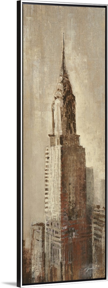 <p>A long vertical contemporary painting of the Chrysler building in New York, done in mute earth tones.</p>