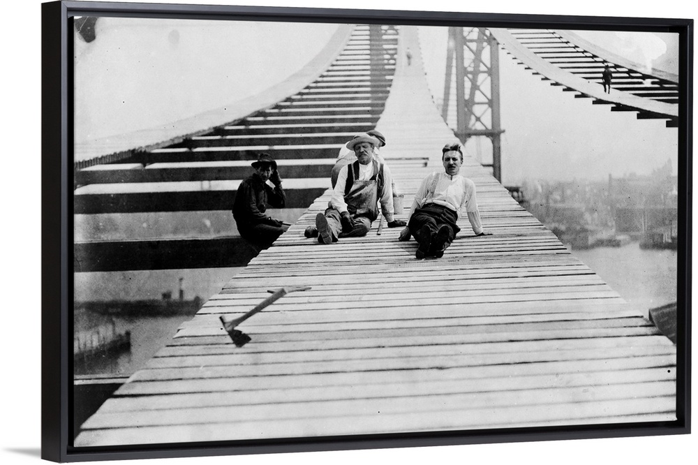<p>Workers resting on footpaths on the Manhattan Bridge during its construction, c1909.</p>