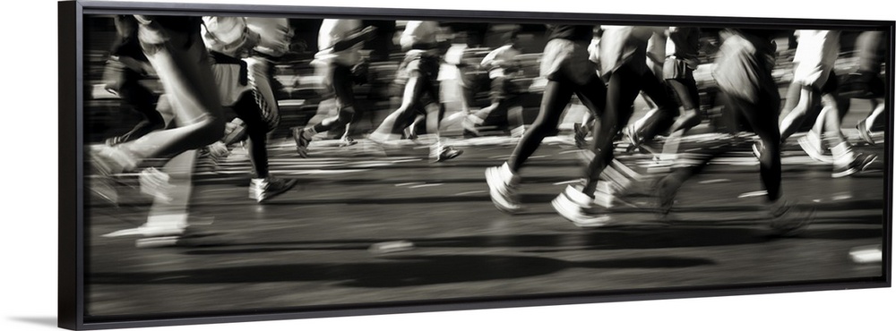 <p>Large, horizontal photograph of many runners from their waists down, running in a blur in the New York Marathon.</p>