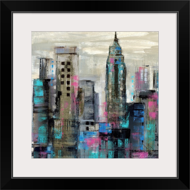 <p>Contemporary painting of a city skyline in dark cool tones.</p>