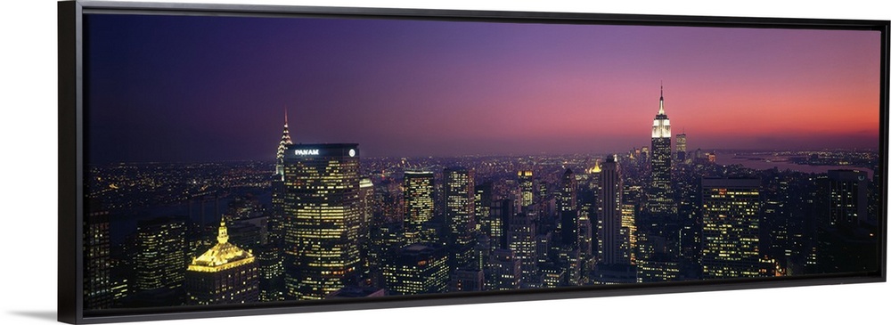 <p>Aerial view of New York City at late dusk with lit up office buildings, the Chrysler Building, and Empire State Building in distance.</p>