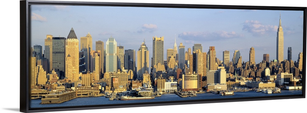 <p>Panoramic photograph shows the daytime skyline of a busy city within the Northeastern United States as it sits on the edge of a large body of water. A couple of the famous skyscrapers in this picture include the Empire State Building and Chrysler Building.</p>