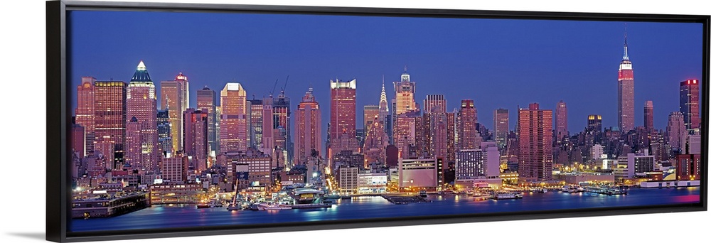 <p>Wide angle photograph of the West side of the New York City skyline, lit up at night, against a deep blue sky.</p>