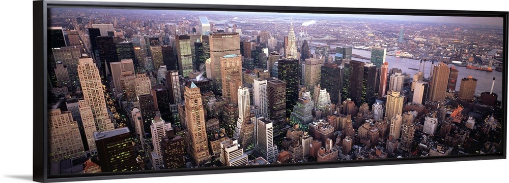 <p>Wide angle, aerial photograph of the New York City skyline.</p>