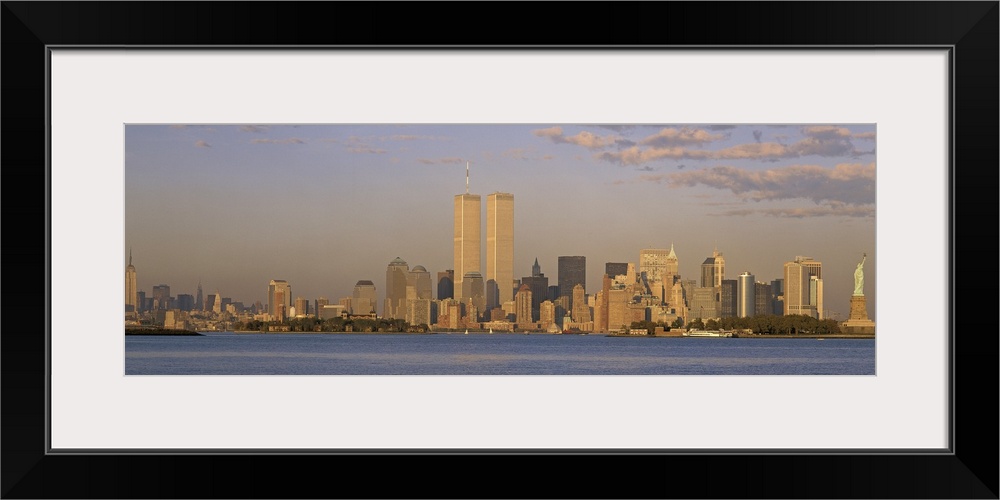 <p>Panoramic image of the NYC skyline with the Twin Towers at sunset.</p>