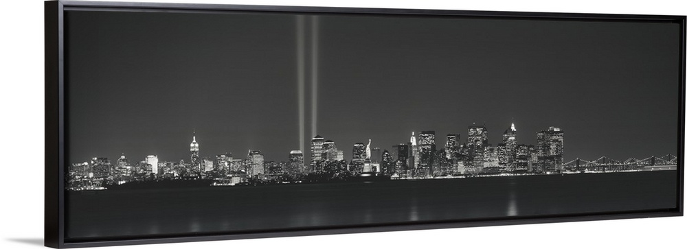 <p>Panoramic vista of the New York City skyline in the evening, with beams of light from the World Trade Center tribute shining in the sky, in black and white.</p>