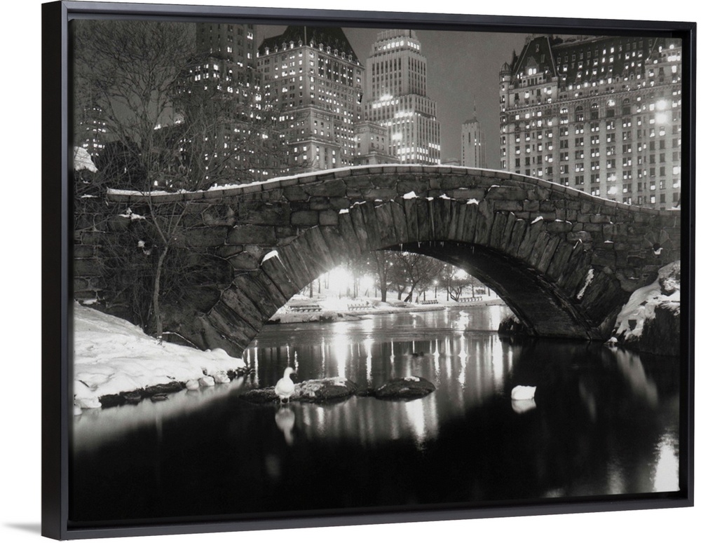<p>12/6/1957-New York, New York- Majestic apartment houses and hotels along New Yorks City's Fifth Avenue glow like christmas trees while Central Park wears her first winter coat. A contrasting rustic touch as provided by this graceful bridge over the glass like lake.</p>