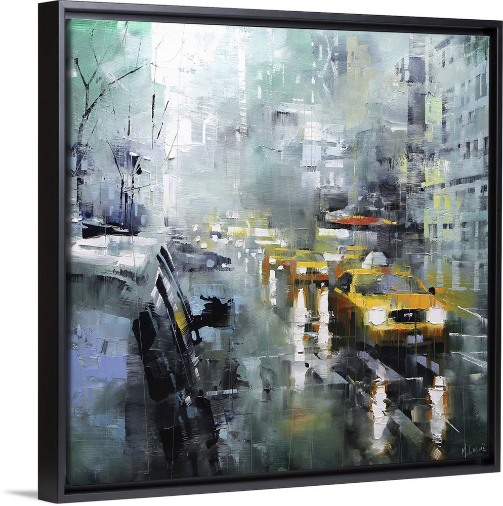<p>Contemporary painting of taxis and other cars in the street on a rainy day in New York City.</p>