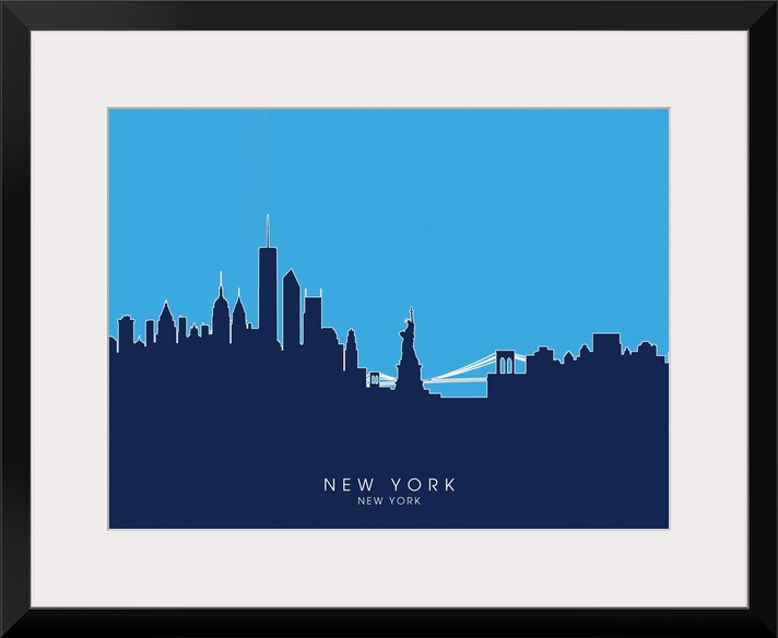 <p>Contemporary artwork of the New York City skyline silhouetted in blue.</p>