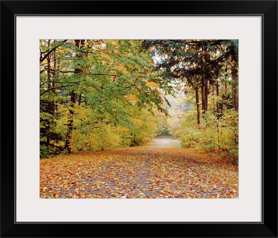 <p>Photograph of fallen autumn leaves on a roadway surrounded by fall trees in Chestnut Ridge State Park in New York.</p>