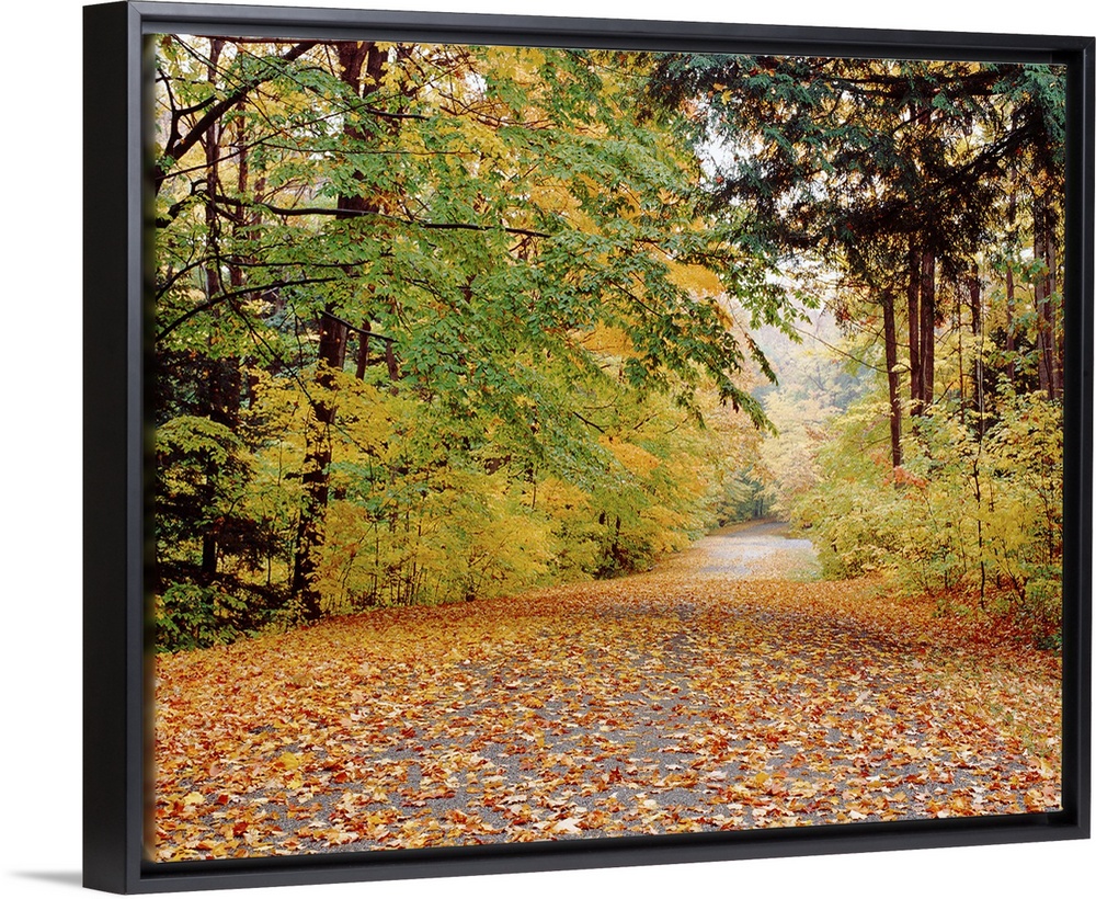 <p>Photograph of fallen autumn leaves on a roadway surrounded by fall trees in Chestnut Ridge State Park in New York.</p>