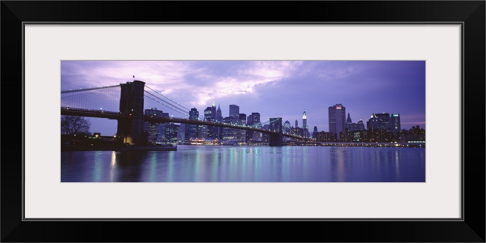 <p>Large, panoramic photograph of the New York skyline, lit up at night, the Brooklyn Bridge in the foreground.</p>