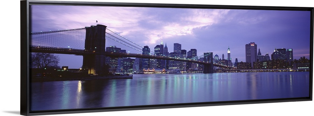 <p>Large, panoramic photograph of the New York skyline, lit up at night, the Brooklyn Bridge in the foreground.</p>
