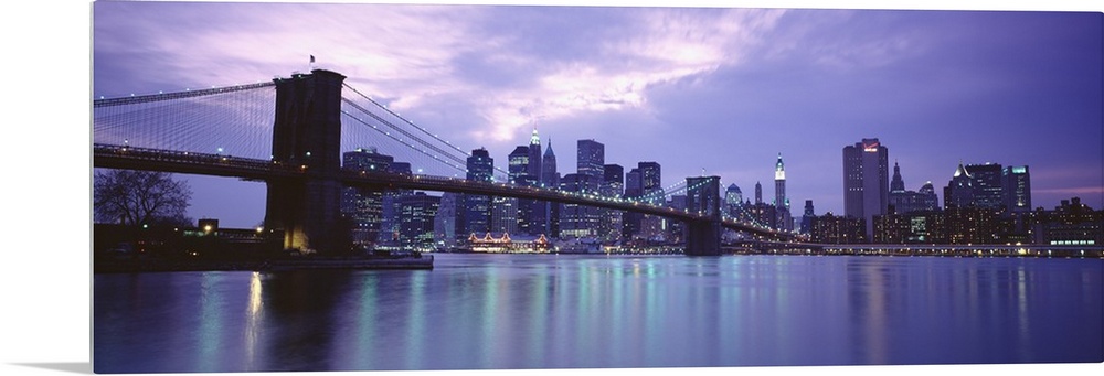 <p>Large, panoramic photograph of the New York skyline, lit up at night, the Brooklyn Bridge in the foreground.</p>