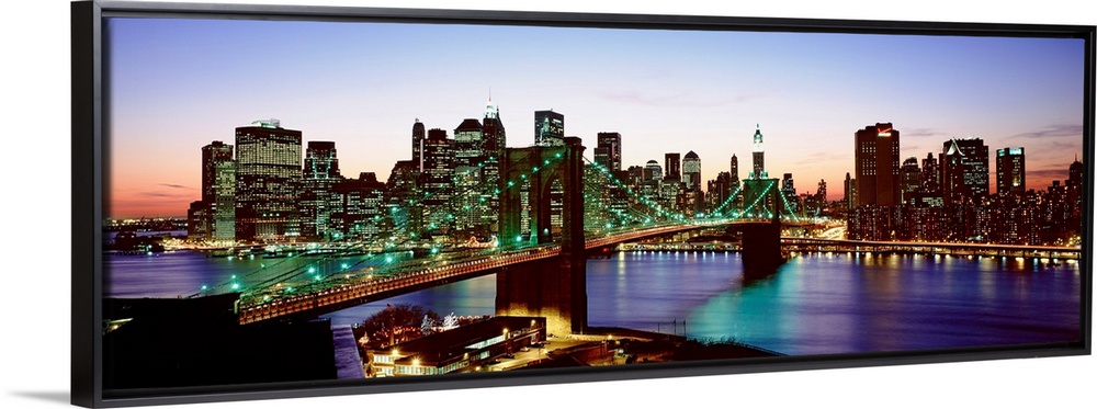 <p>This panoramic photograph shows the entire Brooklyn Bridge and the bottom of the island of Manhattan.</p>