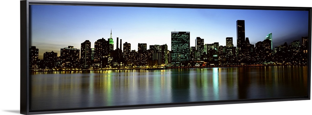 <p>Panoramic photograph of the New York City skyline, lit at dusk and reflecting in the waters in the foreground.</p>
