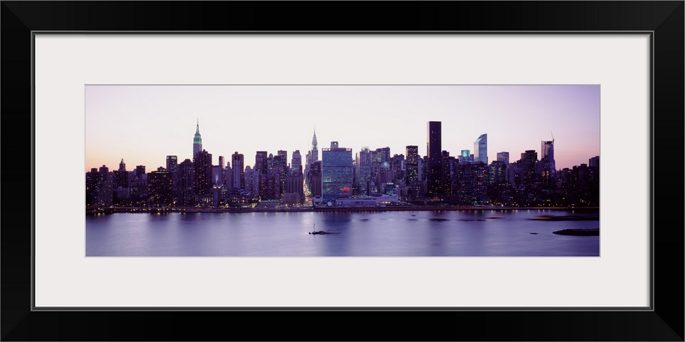 <p>Panoramic wall docor of the New York City cityscape along a waterfront at sunset.</p>